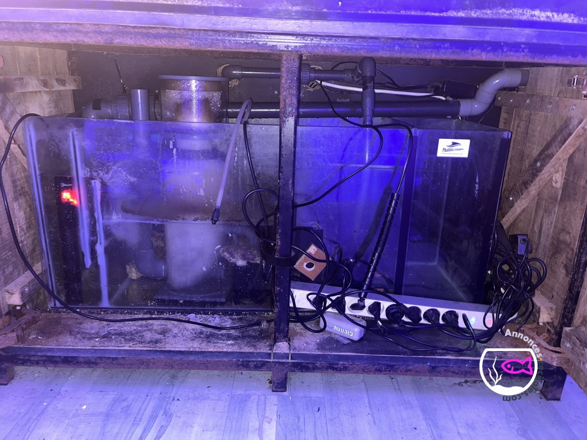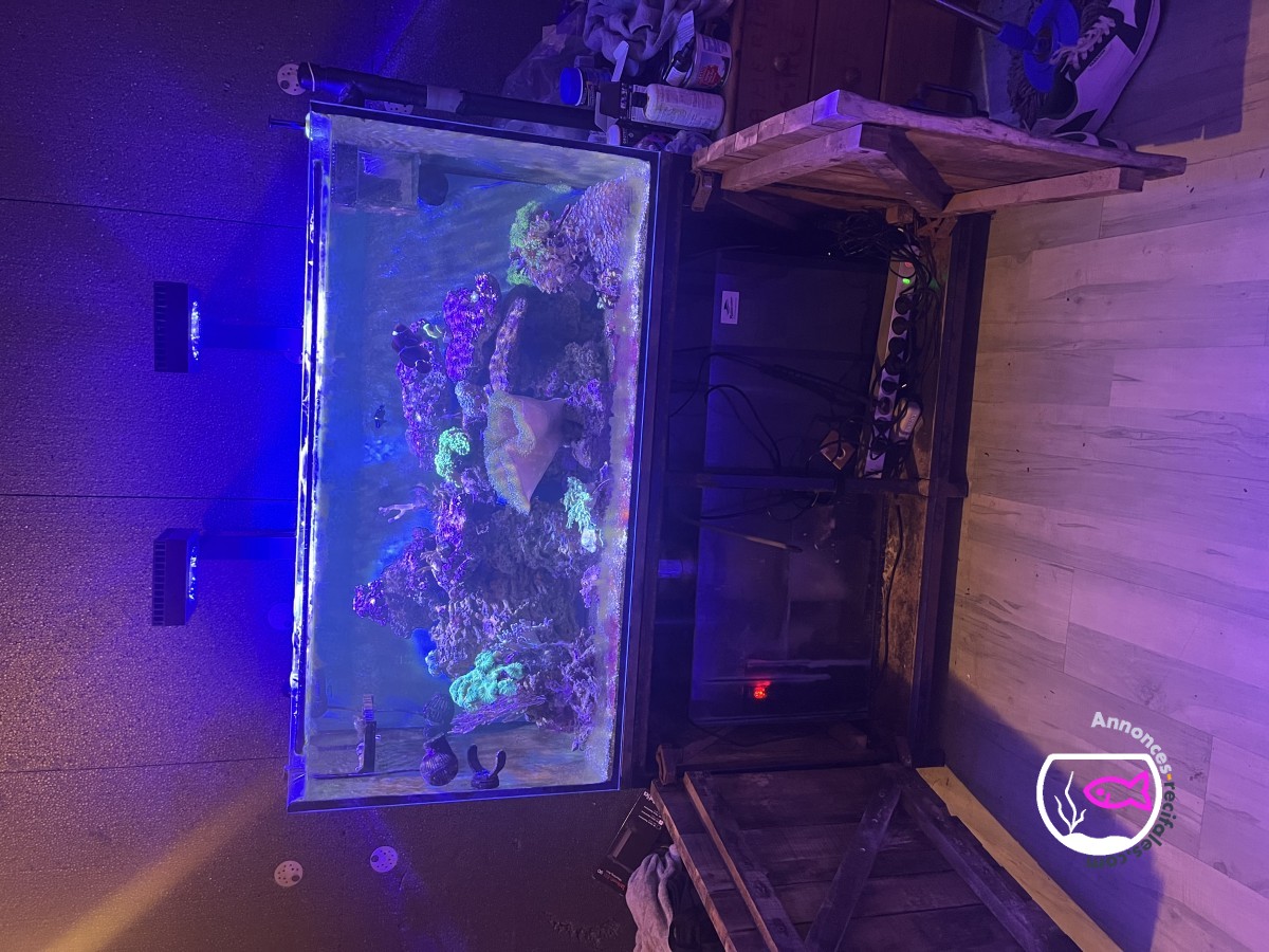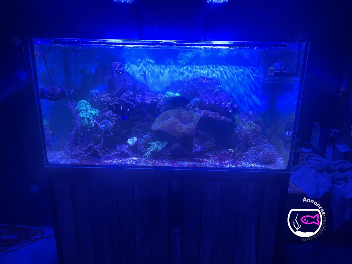 Bonjour vend ou échange mon bac eau de mère complet il a rampe red sea 90 avec les potence brassage tunze est une jecod écumeur aquabee chauffage 500w superfish est pompe de remonté je sai plus il fair 120 longueur 50 largeur 60 auteur sans le meuble avec meuble 133 de hauteur, est un est en planche de chêne il a 4 poisson avec est 8 ou 9 coraux est 30 kilos voi plus de pierre vivante fair offre en mp merci pas de rigoler svp