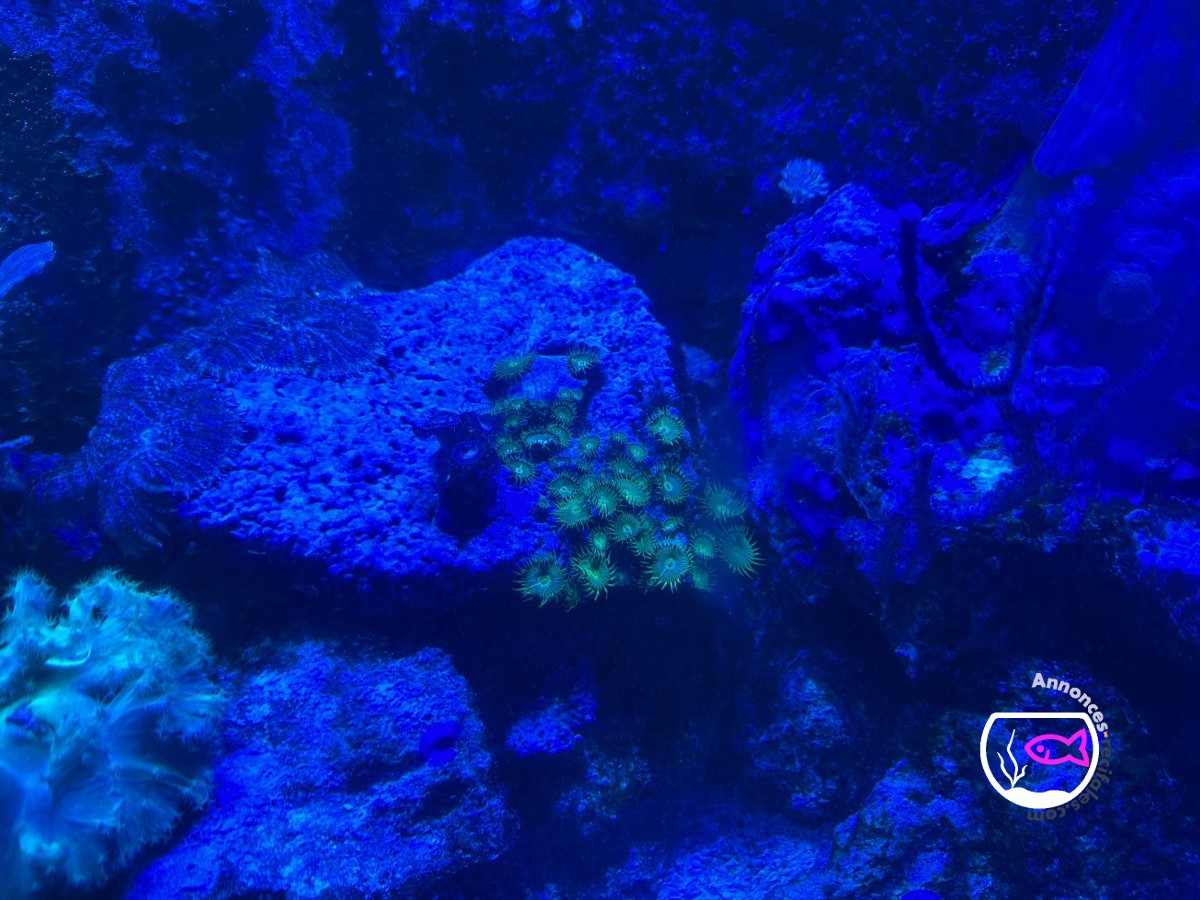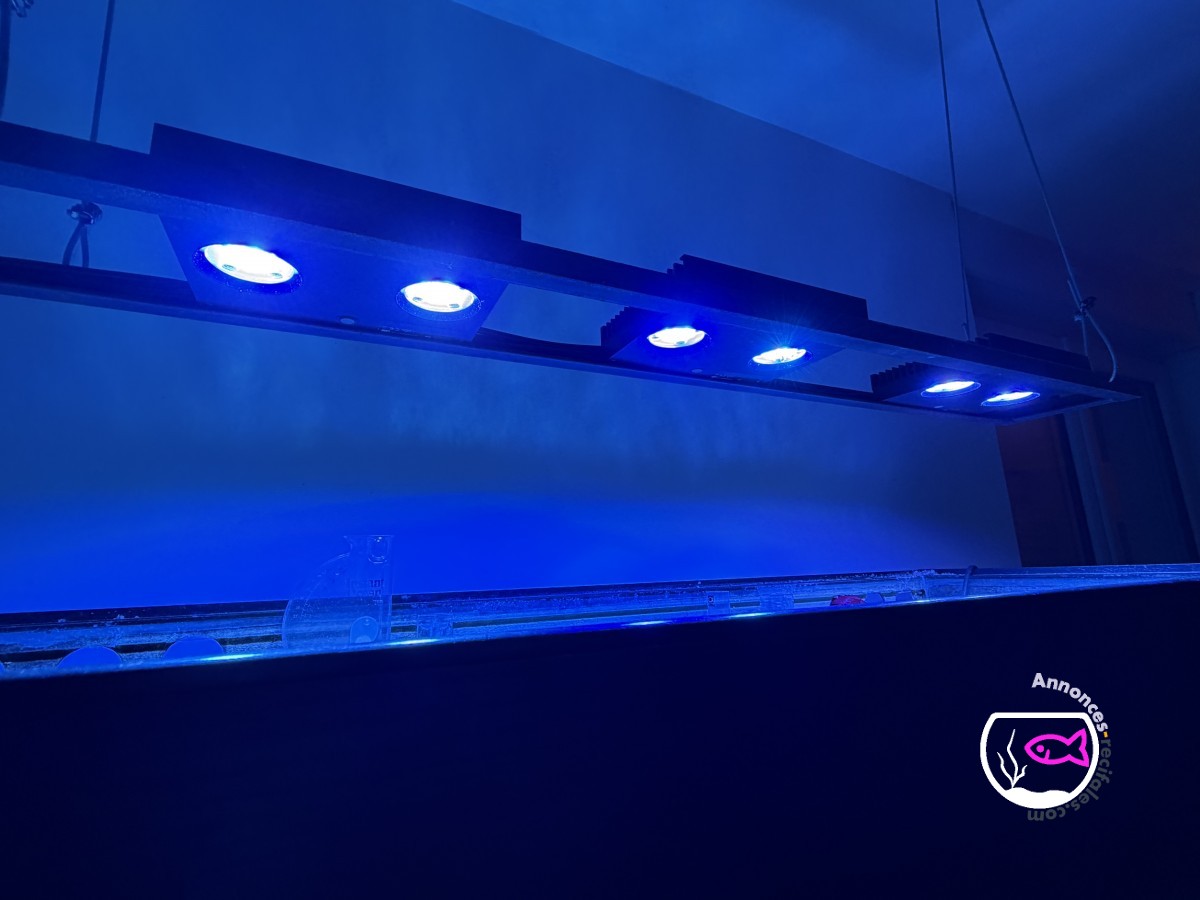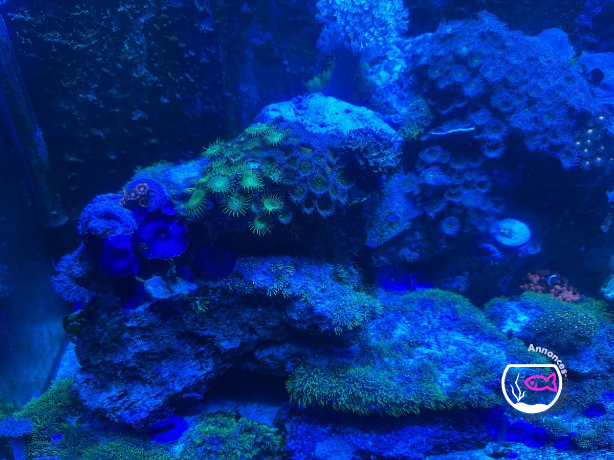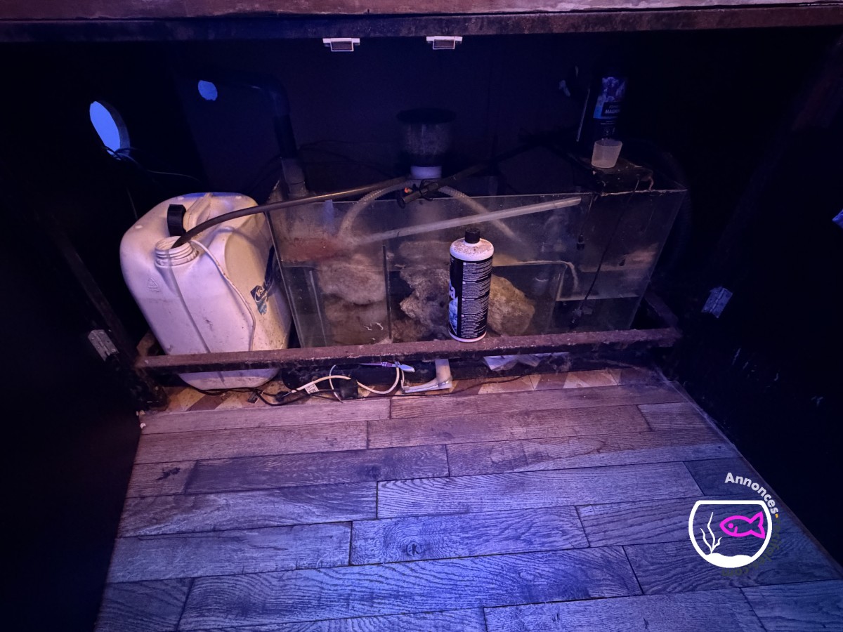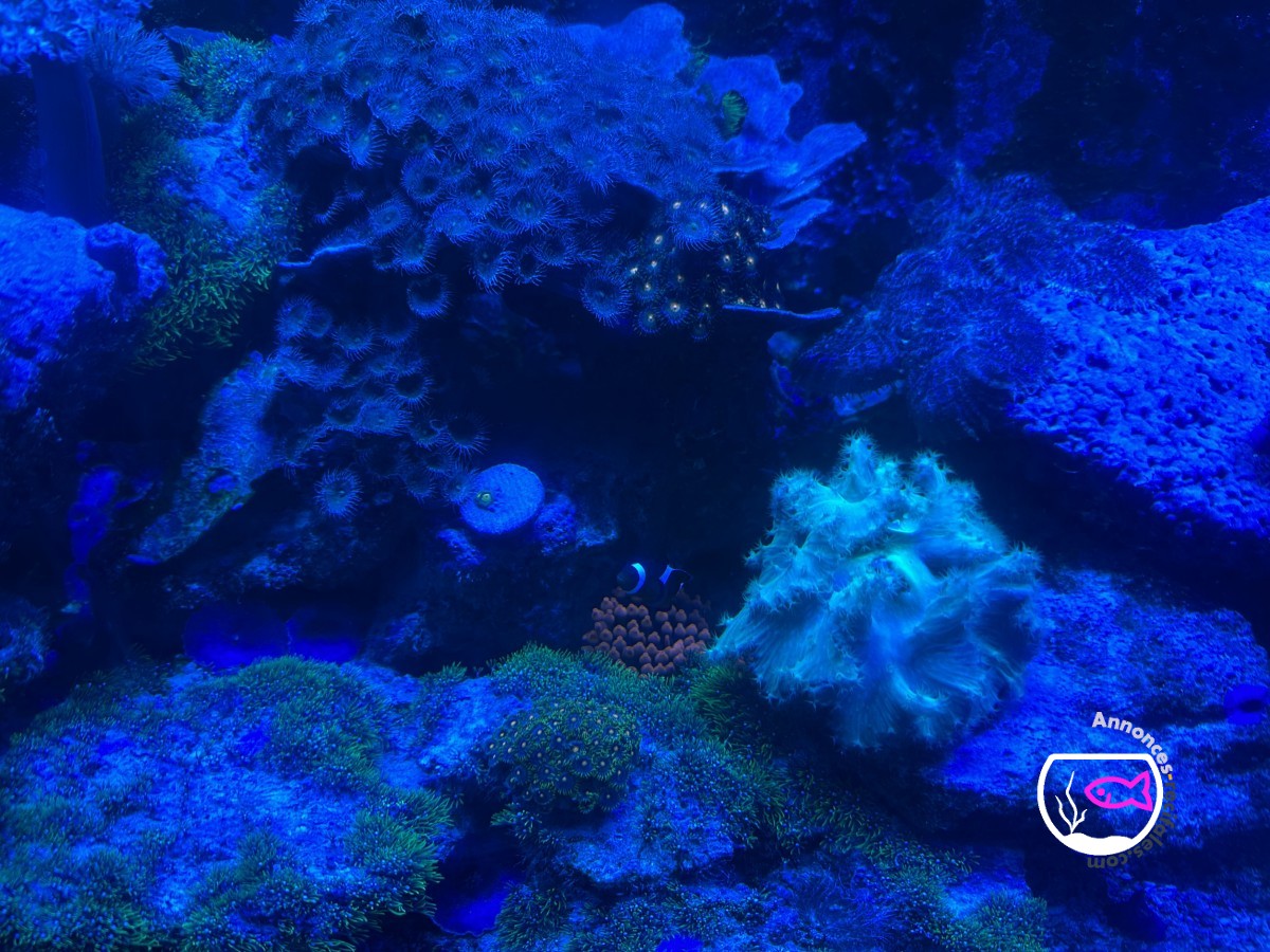 Vends bac et vivant avec écumeur, 3 éclairages hydra HD 32 pilotable en Bluetooth, brassage avec reefwave 45, divers coraux et poissons.
