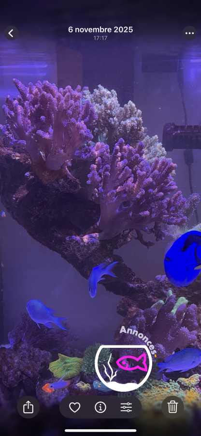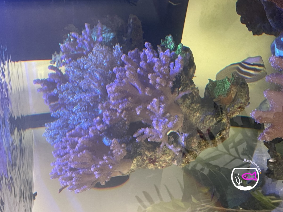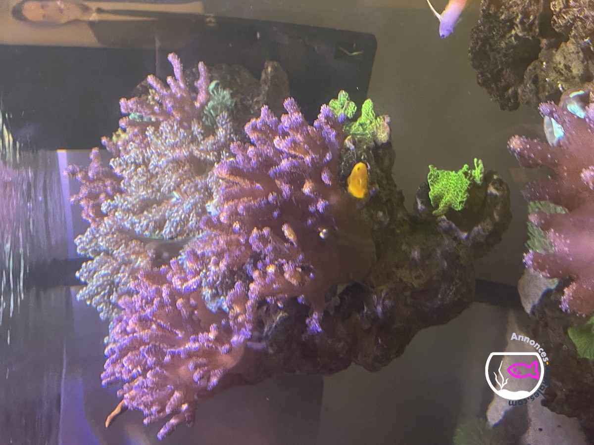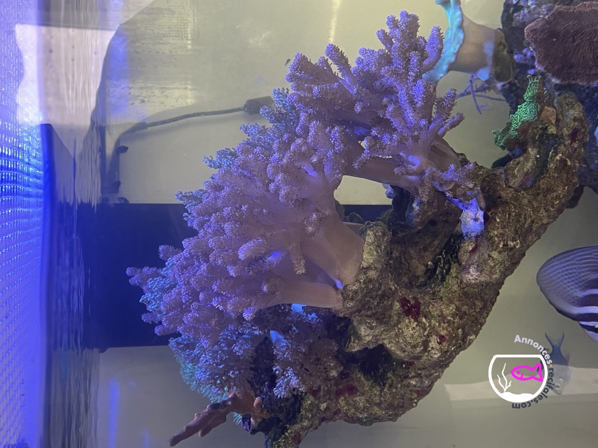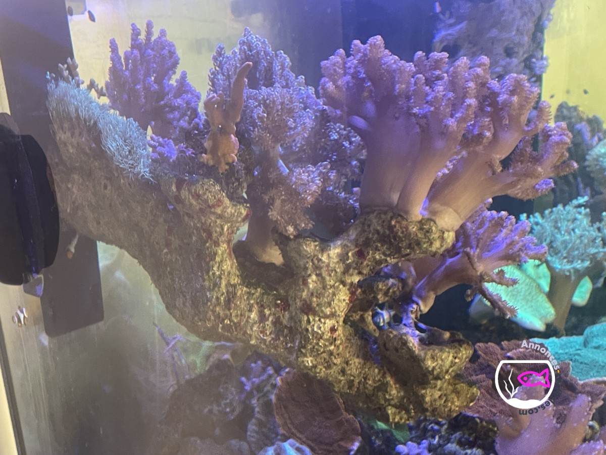 Vend pierre suspendu environ 40cm de long avec les coraux moi dessus 2 sortent de sinularia mauve et gris et du patchy