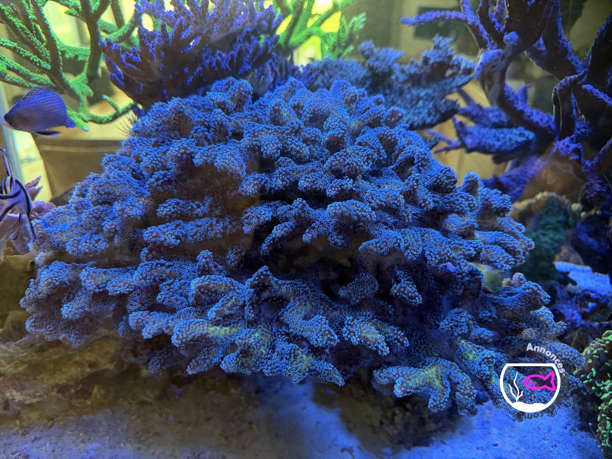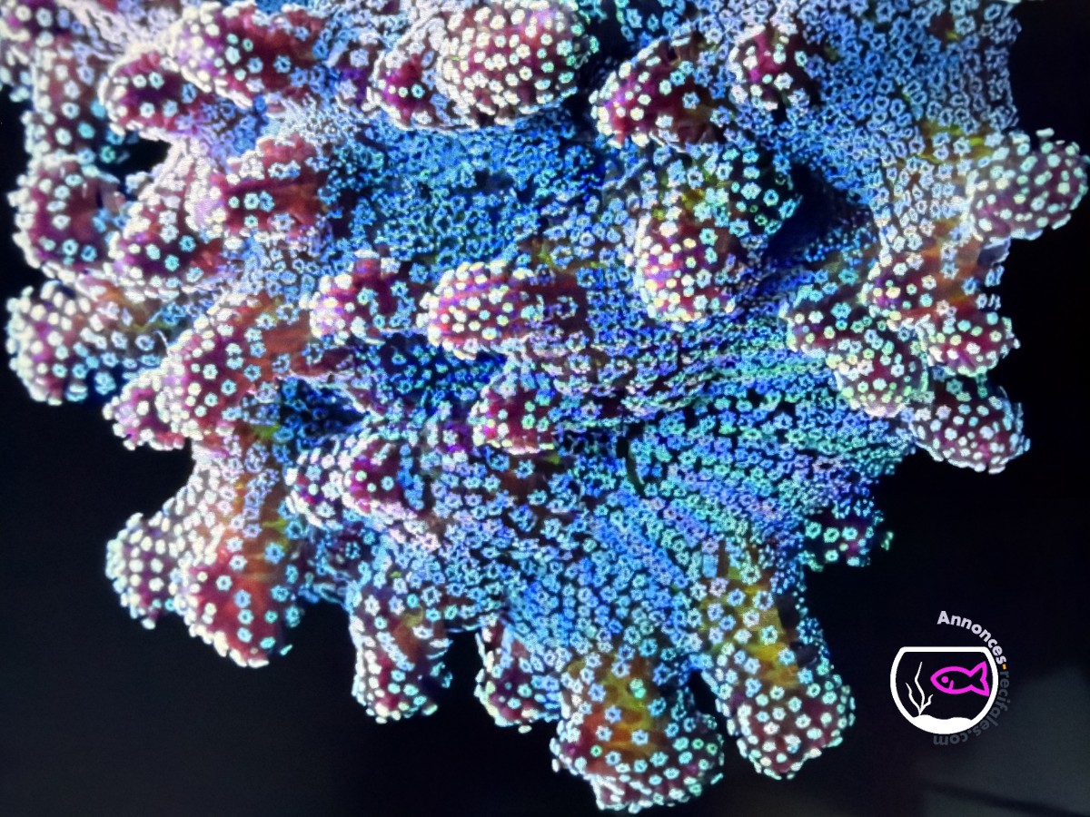 Bouture de stylophora turquoise , selon l éclairage ,ses polypes peuvent paraître turquoise, violets, voire roses