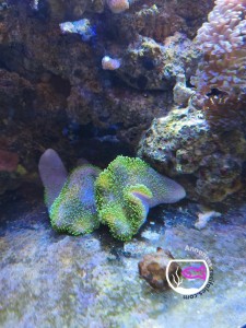Sarcophyton et Sinularia fixés sur grosse pierre vivante.